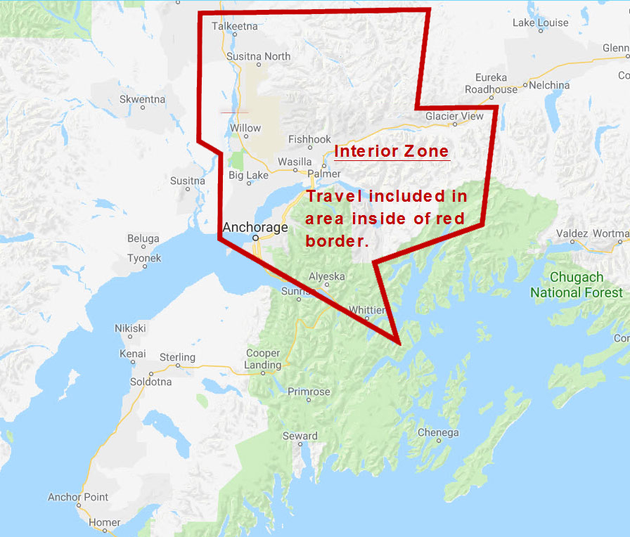 Locations outside of Anchorage zone may require overnight stays and flights. Contact us if you have any questions.